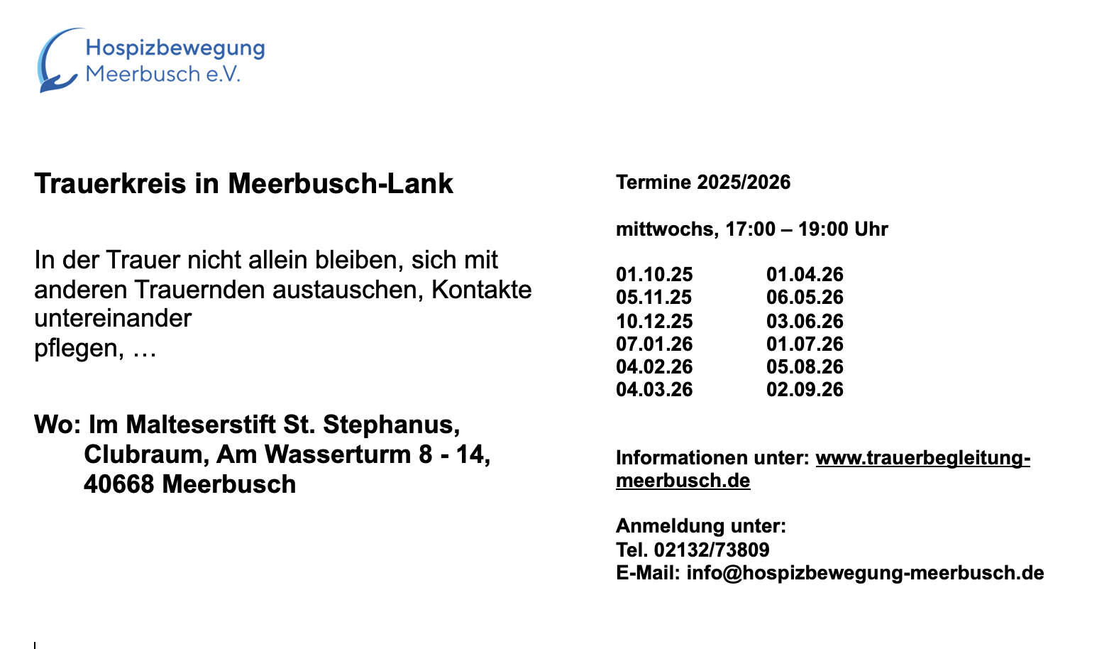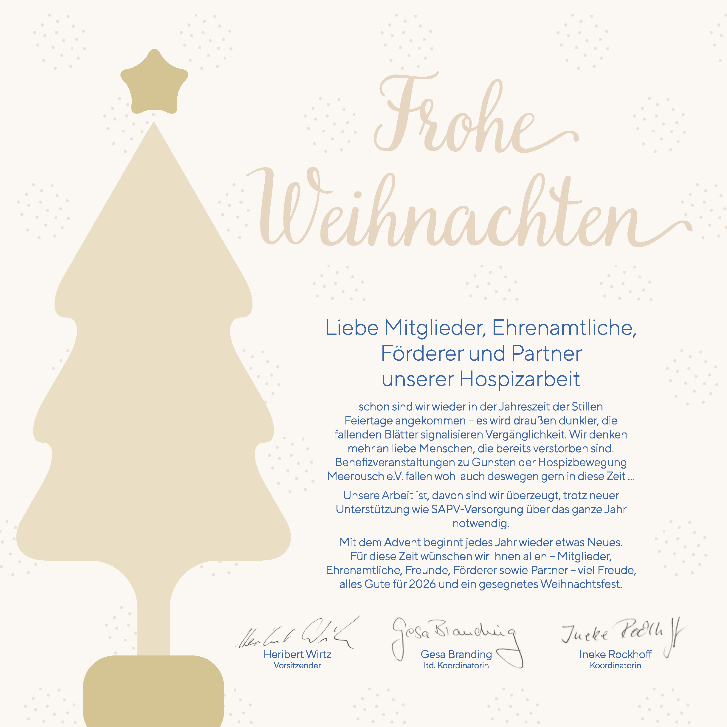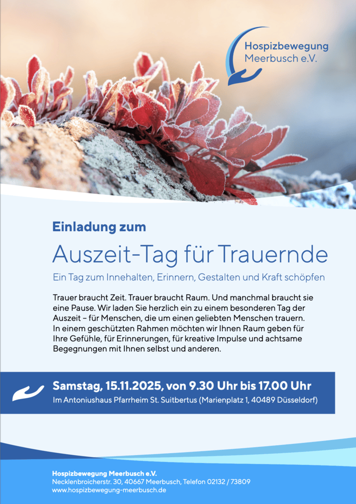 Die Hospizbewegung Meerbusch e.V. setzt sich für die Begleitung schwerkranker und sterbender Menschen ein. Unser Ziel ist es, Ihnen und Ihren An- und Zugehörigen in dieser sensiblen Lebenssituation Beistand zu leisten und die verbleibende Zeit so angenehm wie möglich zu gestalten.